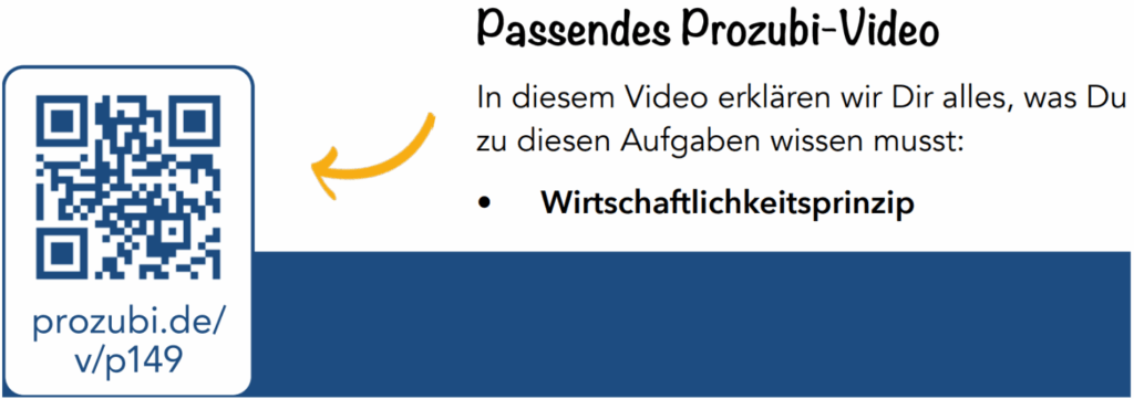 Dazu bekommst Du wie immer bei unseren Prozubi-Plus-Aufgaben eine Musterlösung, mit der Du Deine Ergebnisse einfach selbst vergleichen kannst. Falls Du bei einer Aufgabe einmal nicht weiterkommst, scanne einfach den QR-Code in der PDF und sieh Dir unser Lernvideo zum Wirtschaftlichkeitsprinzip an. Dort erklären wir Dir, worauf es in Deiner IHK-Prüfung wirklich ankommt.